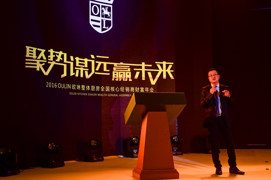 會(huì)議在OULIN歐琳徐劍光董事長(zhǎng)的致辭中拉開(kāi)帷幕,徐總在誠(chéng)摯歡迎與會(huì)嘉賓、經(jīng)銷商的到來(lái)后,對(duì)整體廚房2016年的發(fā)展指明了戰(zhàn)略方向:“OULIN歐琳的第二個(gè)20年如何贏未來(lái),需要堅(jiān)實(shí)有力的謀略,無(wú)論是企業(yè)還是終端門(mén)店需要繼續(xù)傳承OULIN歐琳獨(dú)有的品牌DNA特征,堅(jiān)定歐式、高端的產(chǎn)品符號(hào),打造有品質(zhì)、有價(jià)值、有服務(wù)的廚房空間來(lái)提升競(jìng)爭(zhēng)力。”